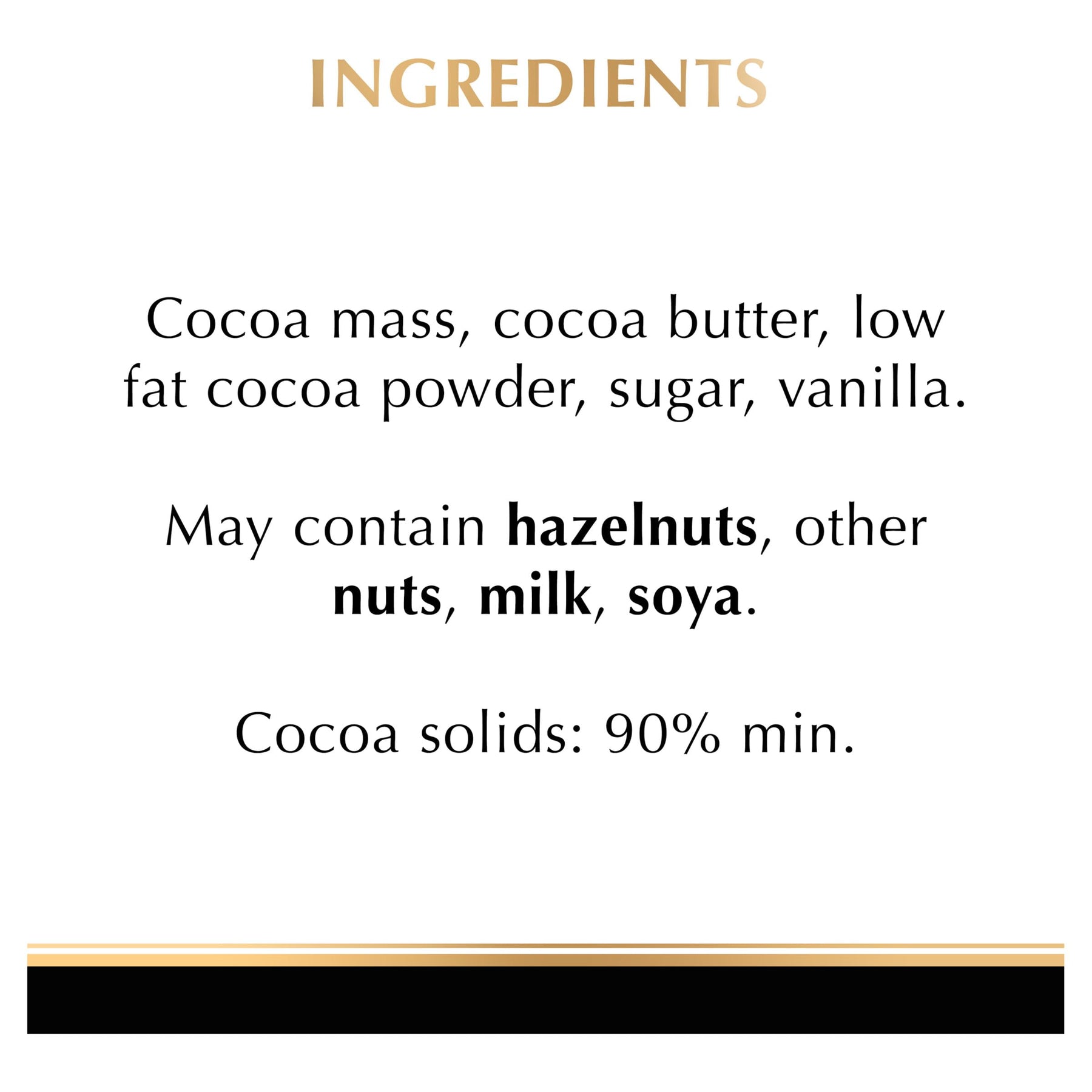 - Ingredients: cocoa mass, cocoa butter, low fat cocoa powder, sugar. May contain hazelnuts, almonds, other nuts, milk and soya.