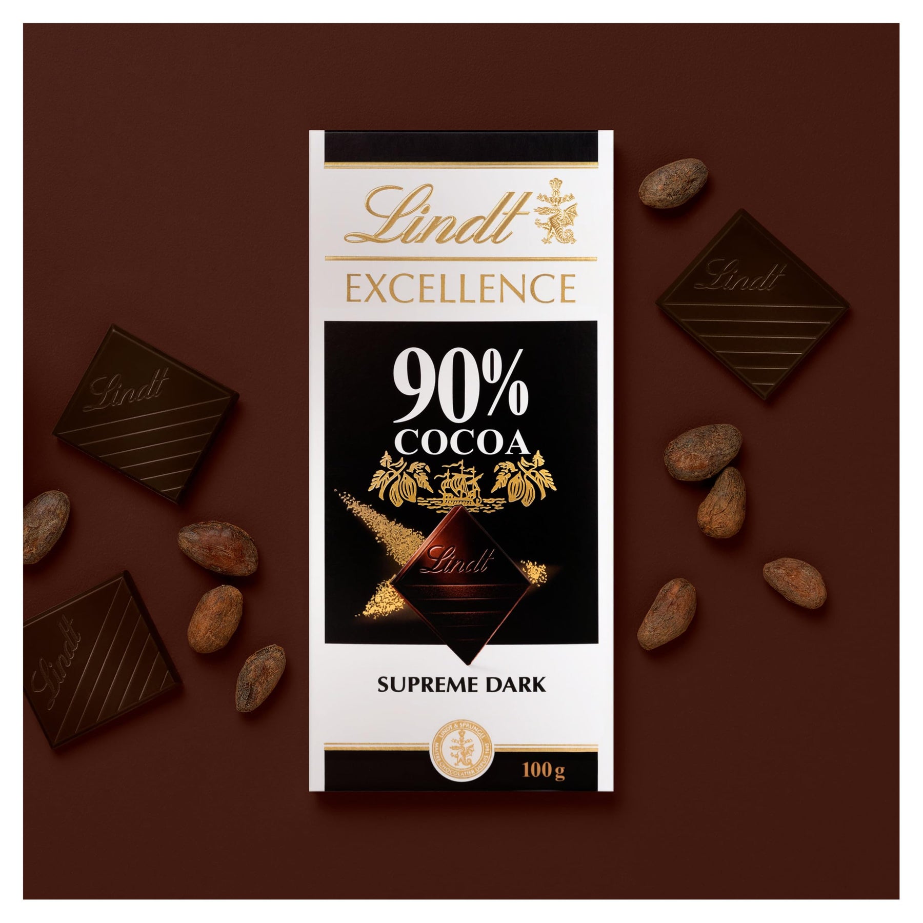 Lindt Excellence Supreme Dark 90% cocoa chocolate is a rich, luxurious bar crafted by Lindt Master Chocolatiers using the finest sustainably sourced cocoa beans. With a profound cocoa flavor and balanced intensity, this dark chocolate delivers a sensory experience—enjoy the deep aroma, crisp snap, and velvety melt that unfolds a symphony of cocoa notes on the palate. Exceptionally thin diamond-shaped pieces offer an elegant treat for true chocolate connoisseurs.
