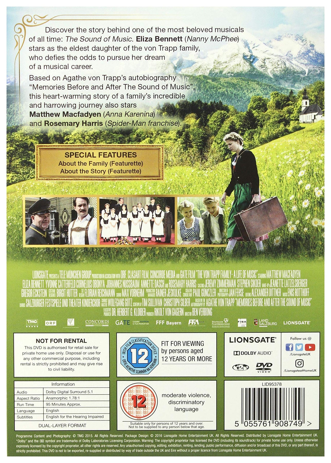 Entdecken Sie die Geschichte hinter einem der beliebtesten Musicals aller Zeiten: The Sound of Music. Eliza Bennett (Nanny McPhee) spielt die älteste Tochter der Familie von Trapp und trotzt allen Widrigkeiten, um ihren Traum von einer Musikkarriere zu verwirklichen. Die wahre Geschichte ihrer unglaublichen und erschütternden Reise. Basierend auf Agathe von Trapps Autobiografie „Memories Before and After the Sound of Music“, dieser herzerwärmenden Geschichte einer Familie, die in verzweifelte Umstände gerät, spielen auch Matthew Macfadyen (Anna Karenina) und Rosemary Harris (Spider-Man-Franchise) mit.