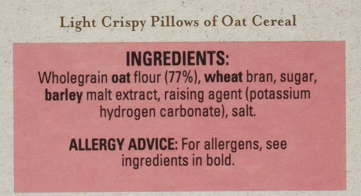 - Wholegrain rolled OAT (86%), WHEAT bran, sugar, BARLEY malt extract, raising agent (potassium bicarbonate), salt