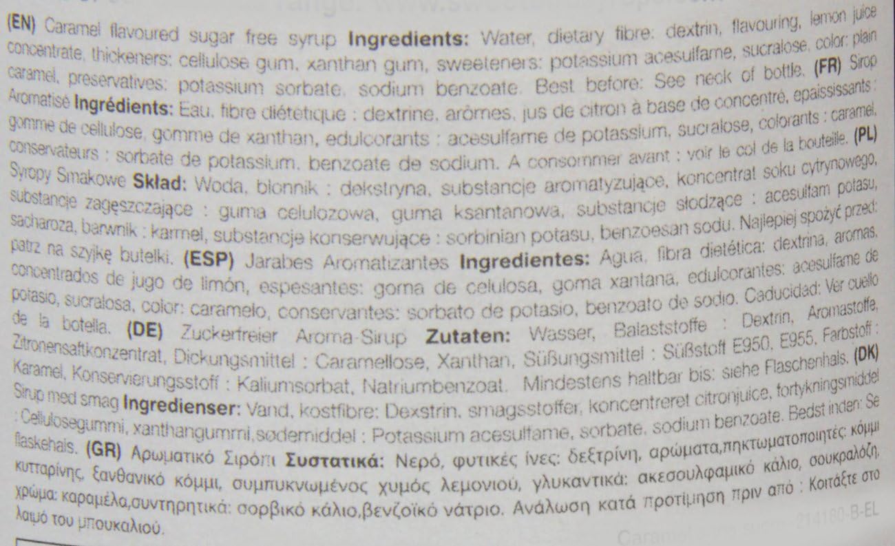 • Ingredients: Water, dietary fibre (dextrin), flavouring, lemon juice from concentrate, thickeners (cellulose gum, xanthan gum), sweeteners (potassium acesulfame, sucralose), colour (plain caramel), preservatives (potassium sorbate, sodium benzoate)