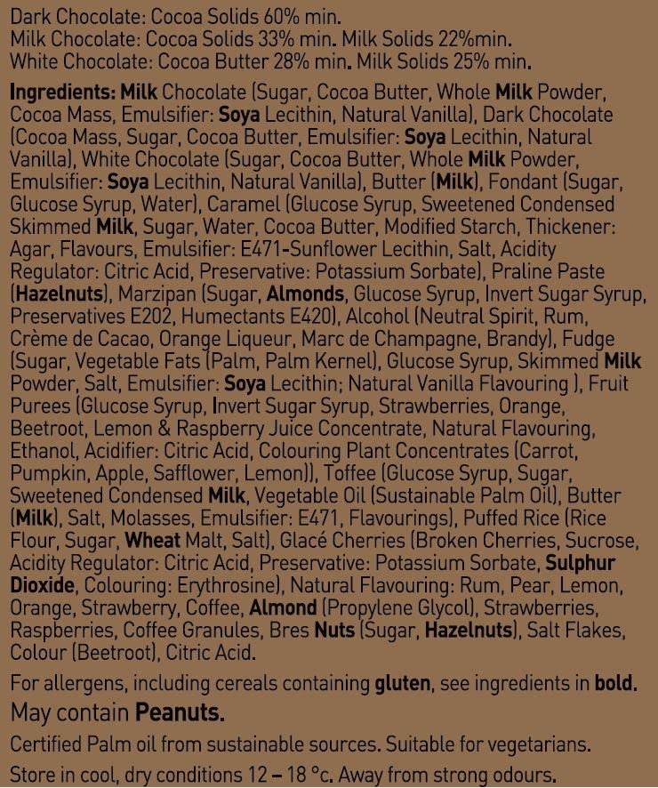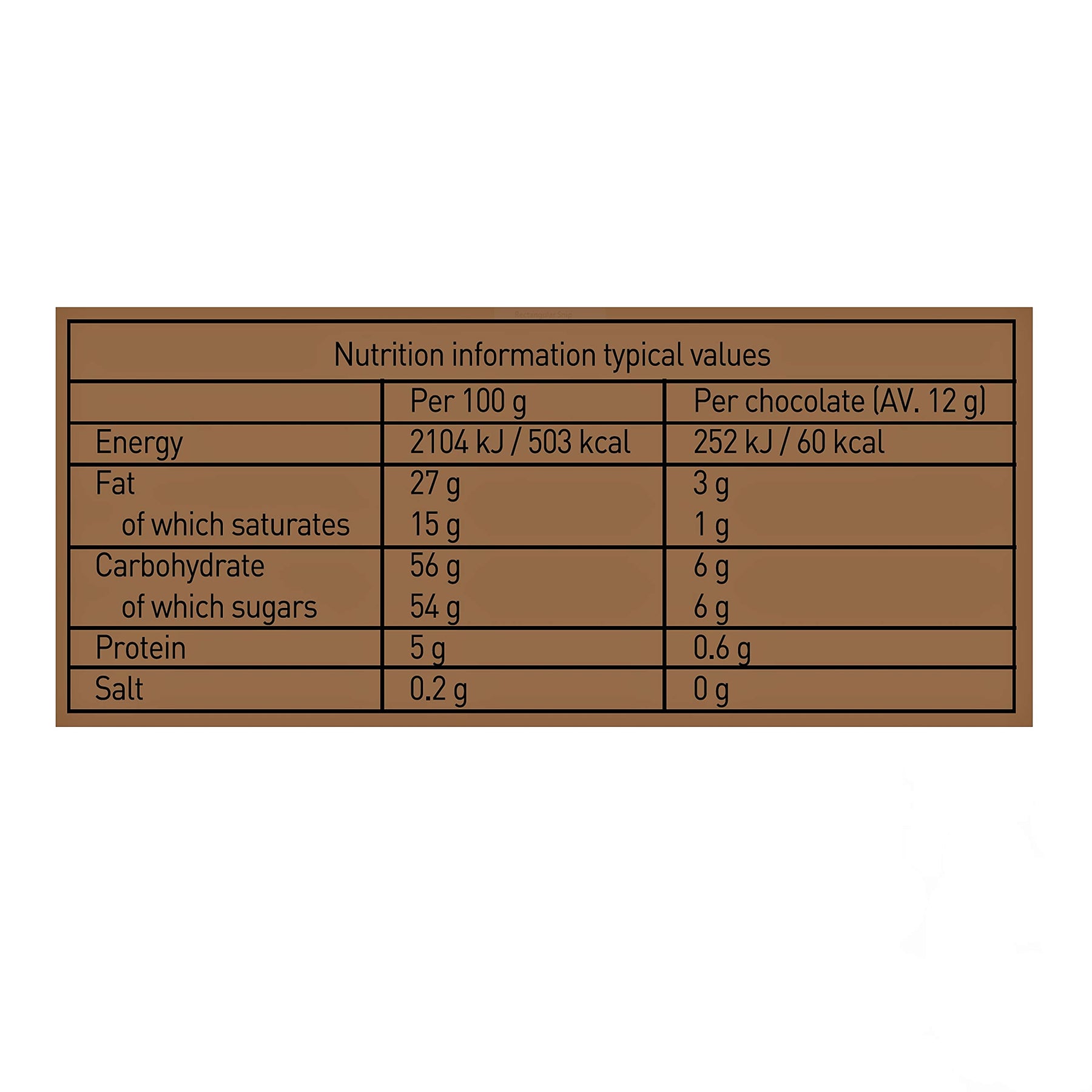 - Contains an assortment of creams, caramels, and pralines coated in milk, dark, or white chocolate