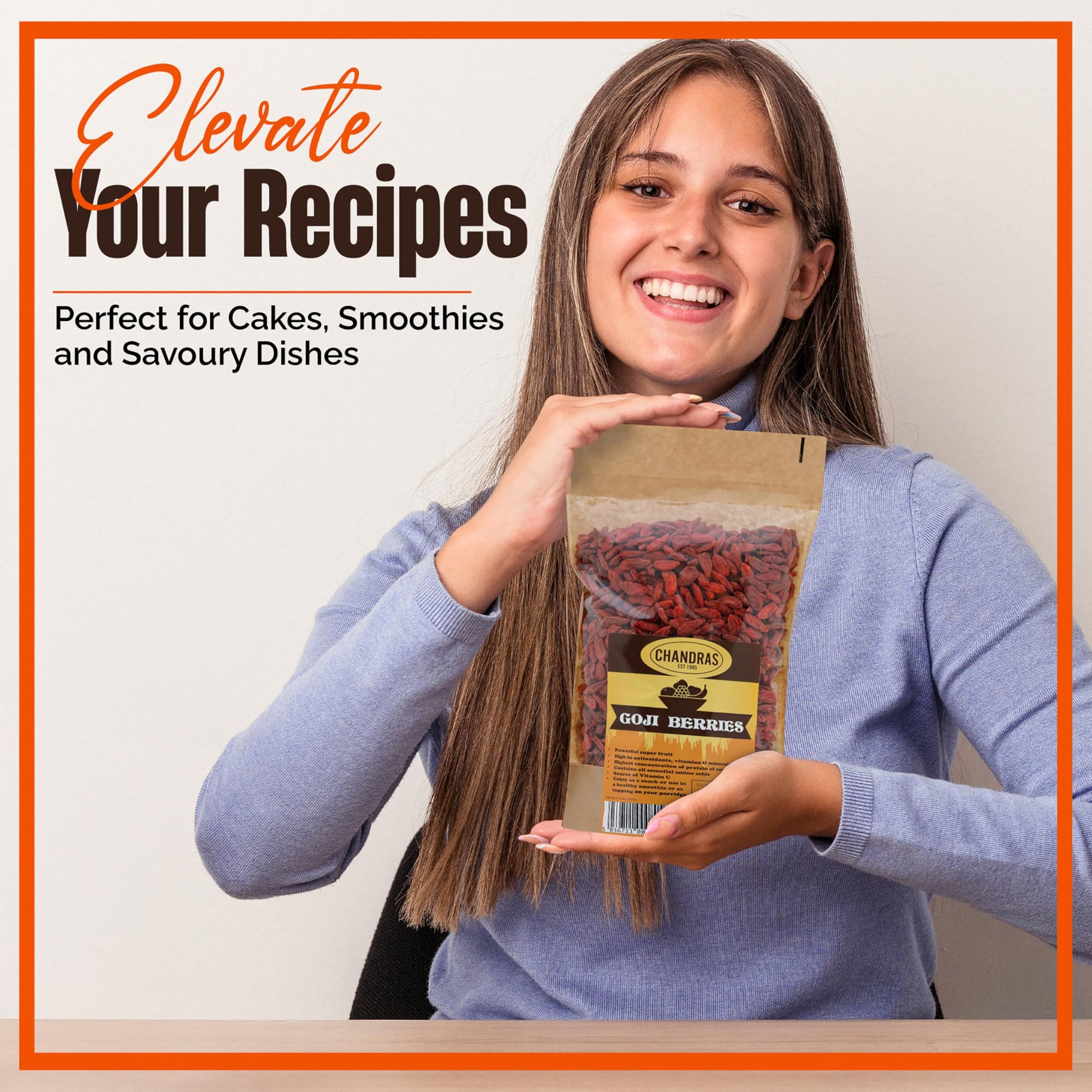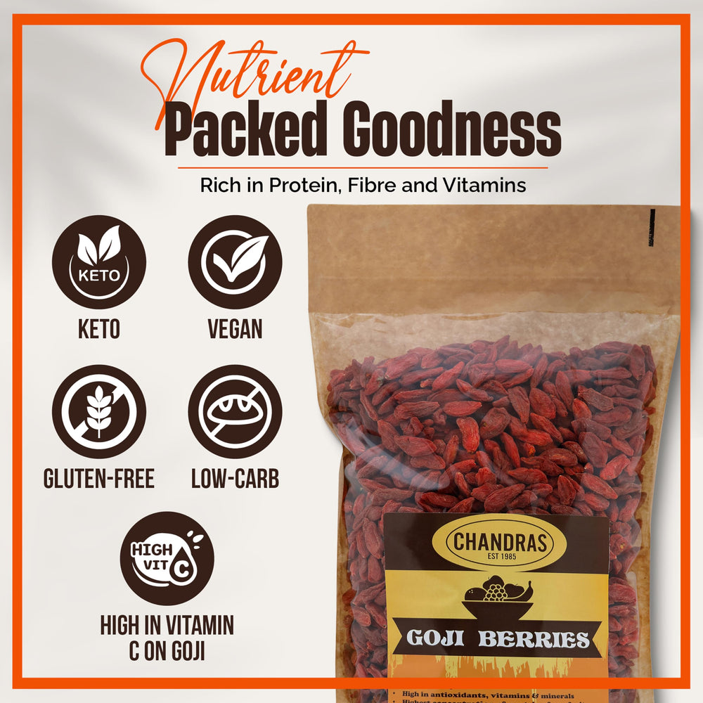 Chandra Whole Foods Goji Berries are a nutritious, gluten-free, and vegan-friendly superfruit packed with essential vitamins, minerals, and antioxidants. These 100% pure goji berries are naturally sweet with a slightly tangy flavor, making them a delicious and healthy addition to your daily diet. Ideal for health-conscious individuals, they support immunity, eye health, and overall well-being.