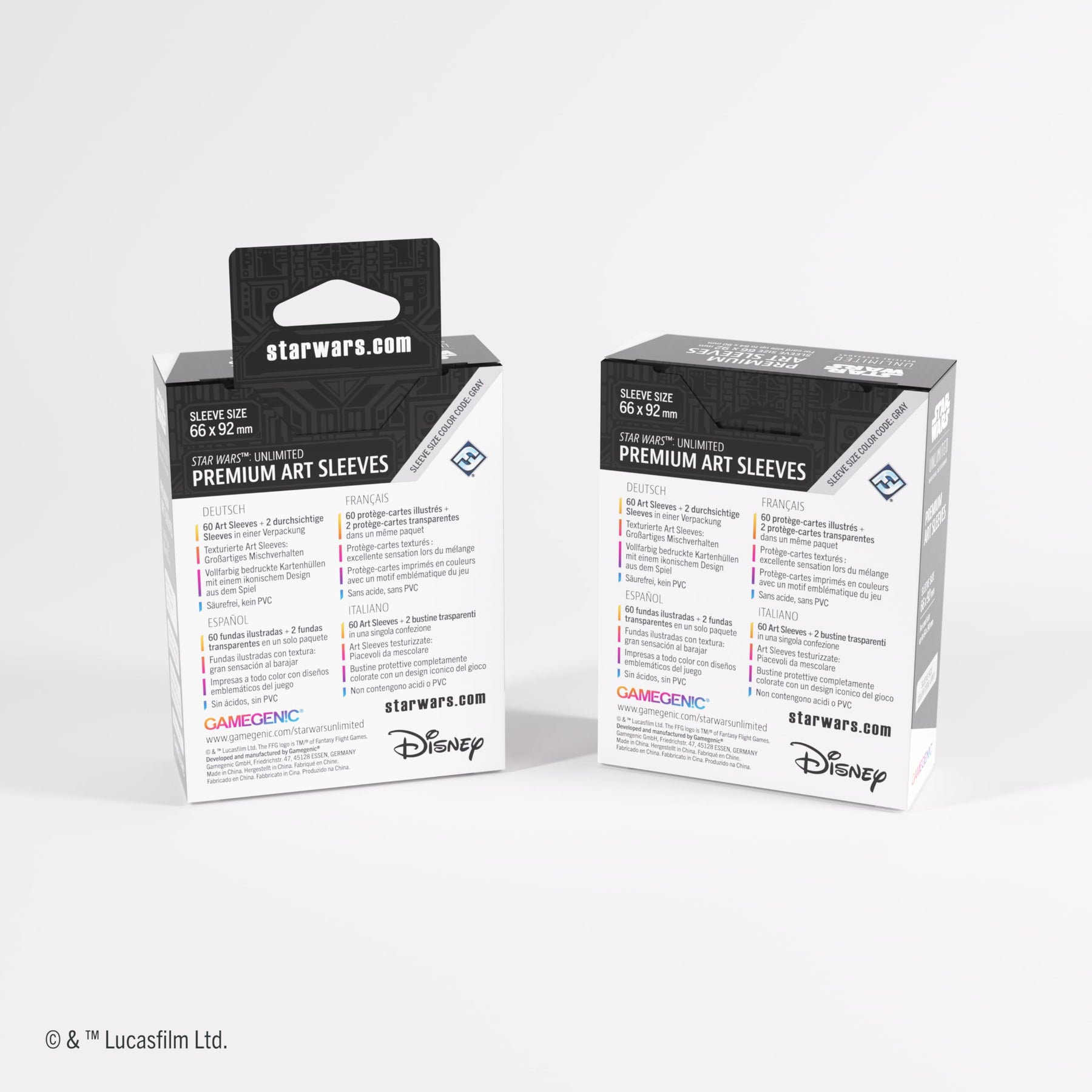 Protect and showcase your Star Wars: Unlimited cards with Gamegenic's Premium Art Sleeves, officially licensed for authentic style and superior protection. These full-color printed sleeves feature a clear front for vibrant card display and a textured matte black back to enhance shuffle performance and durability.