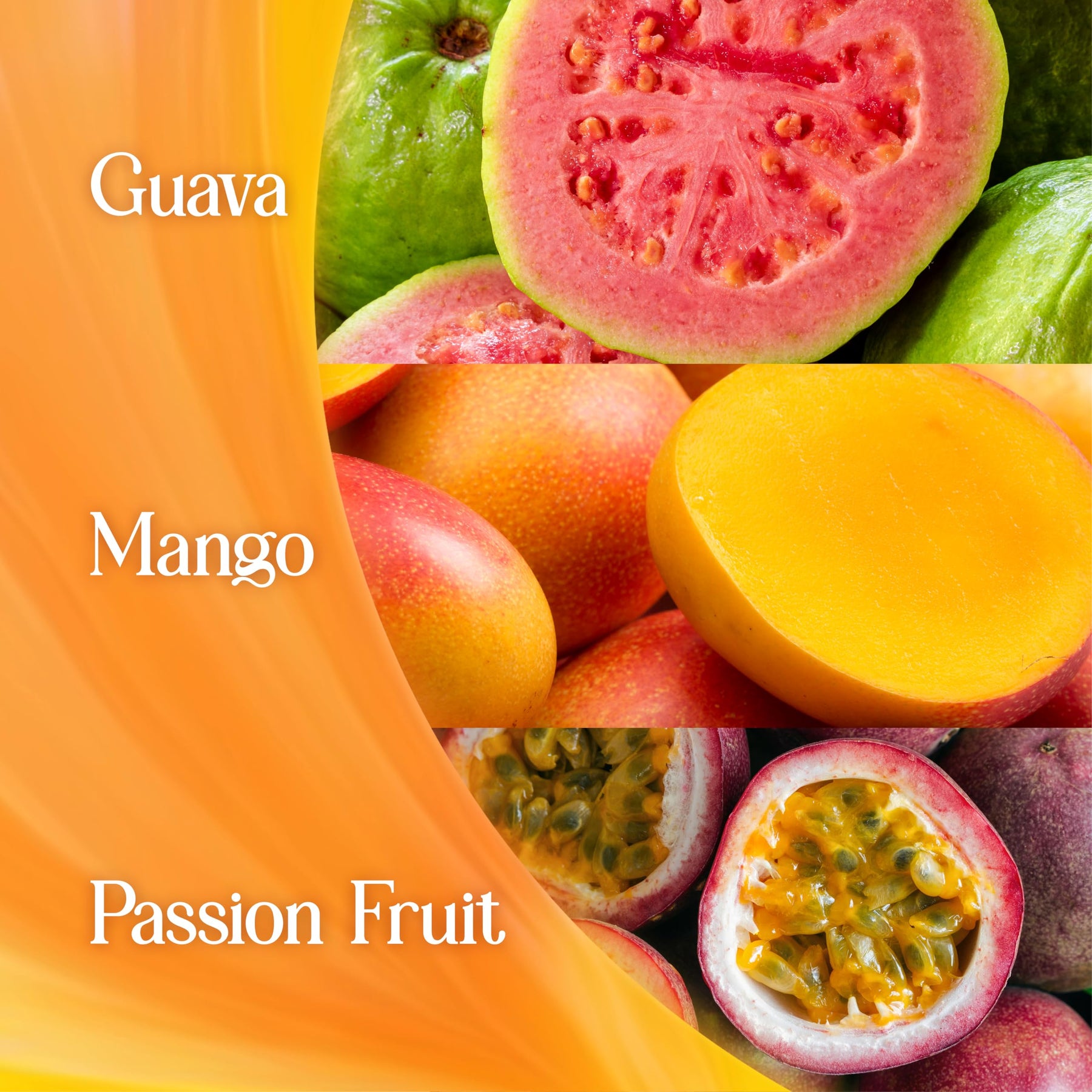 • Fragrance infused with juicy mango, guava, passion fruit, freesia, rose petals, and musk