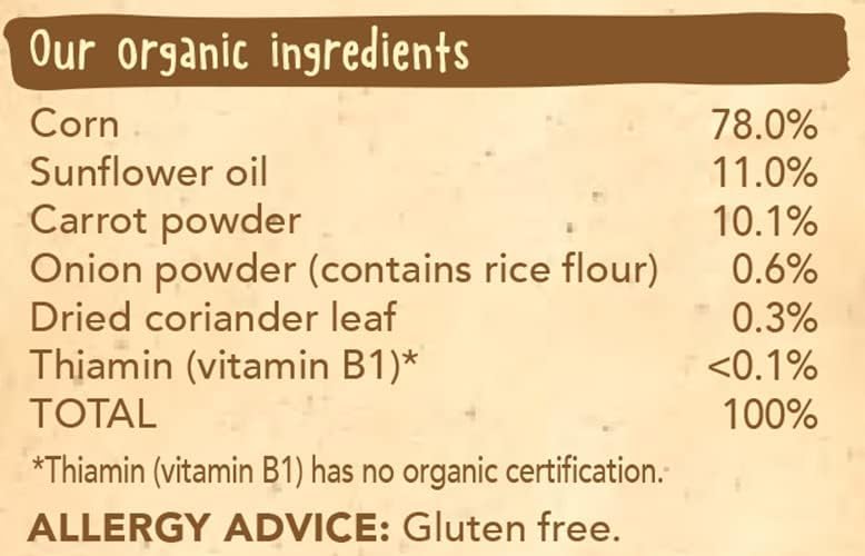 Ingredients: Corn 78%, Sunflower oil 11%, Carrot Powder 10%, Onion powder (contains rice flour) <1%, Dried coriander leaf <1%, Thiamin (Vitamin B1)* <1%.