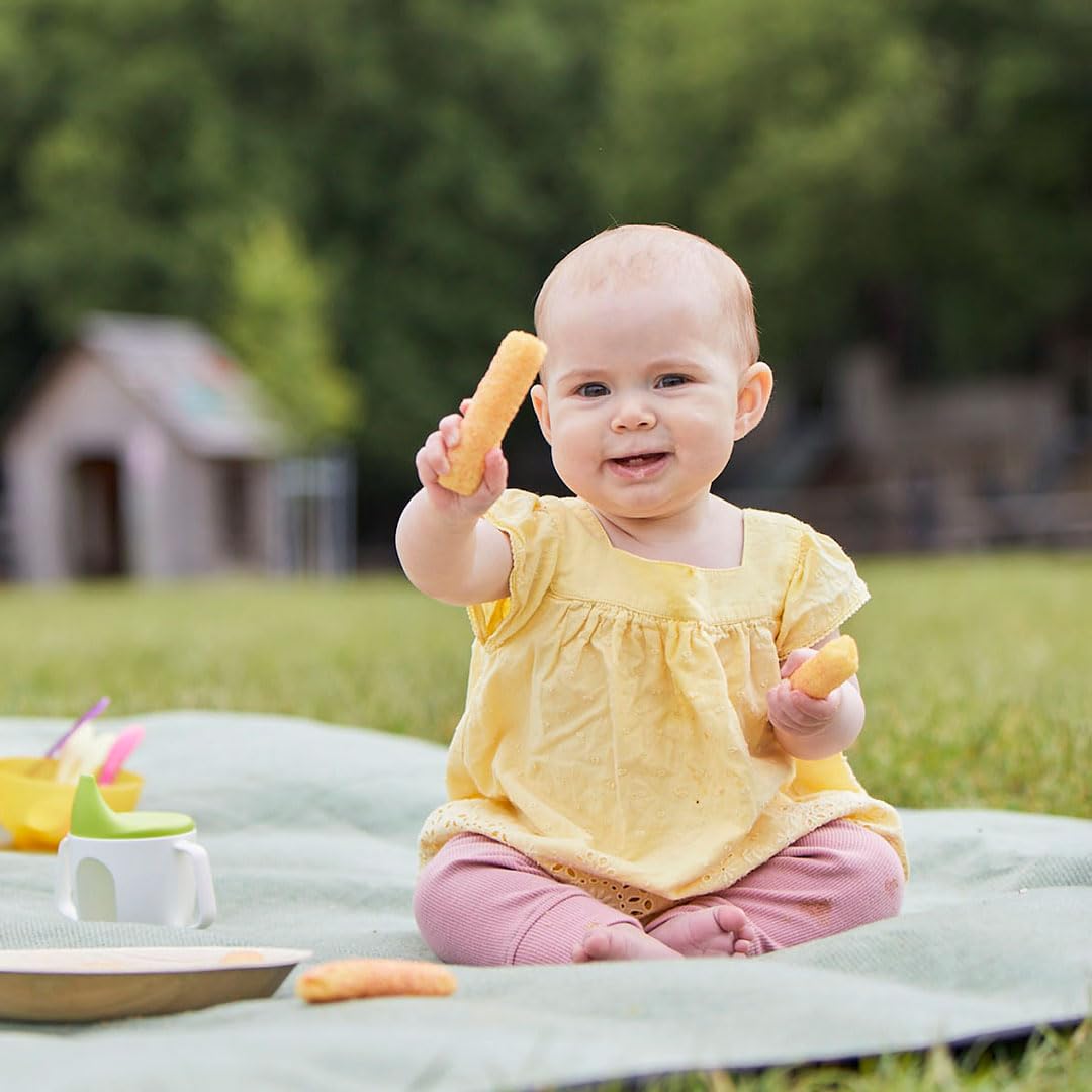 Organix Carrot & Herb Stix are gently baked, not fried, organic finger food snacks ideal for toddlers 10 months and older. Made with 78% corn and enriched with real carrot powder and a hint of coriander, these light and crispy corn puffs support healthy weaning. The chunky stick shape is designed for little hands to grasp, promoting self-feeding and fine motor skill development.