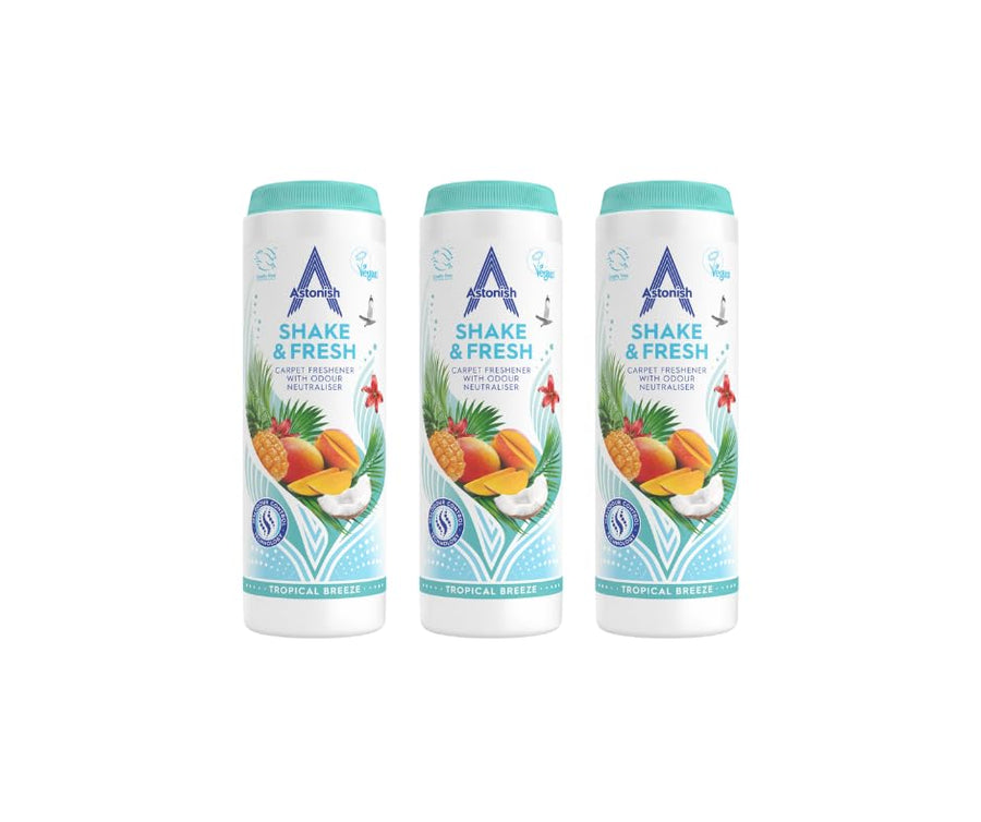 Astonish Shake & Fresh Carpet Freshener - Tropical Breeze Odour Eliminator, 3-Pack