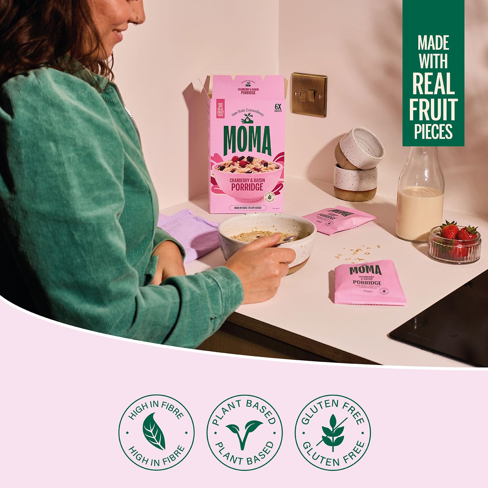 MOMA Cranberry & Raisin Porridge Sachets provide a quick, nutritious breakfast made with 100% wholegrain British oats and real fruit pieces. Ready in just 2 minutes, this creamy porridge delivers sustained energy and a delicious blend of cranberries and raisins with no added sugar.