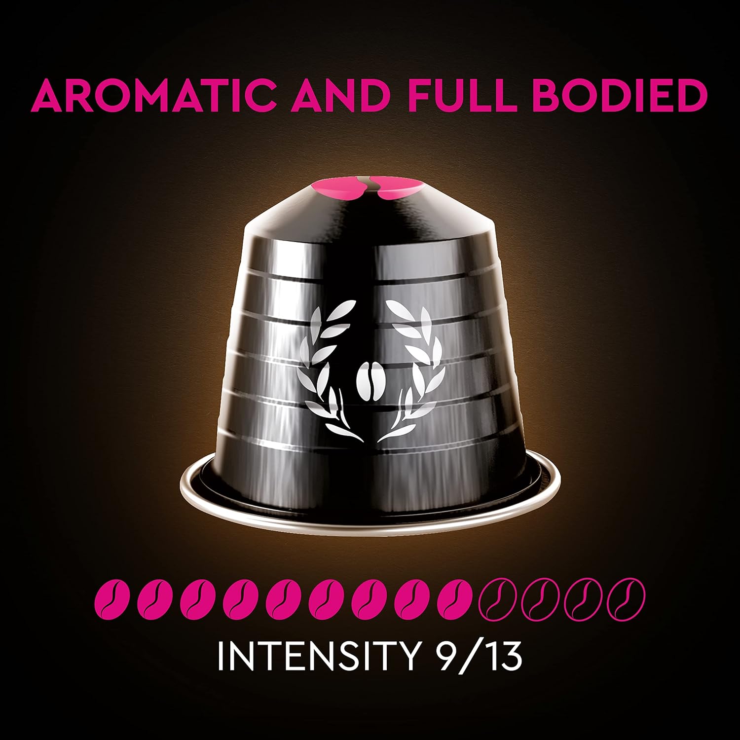 Espresso Intense by Carte Noire delivers a rich and intense coffee experience with a full-bodied flavour and notes of dried fruit and chocolate. Crafted from a darkly roasted 100% Arabica blend, this coffee offers a bold intensity rated at 9/10, perfect for those who appreciate a powerful espresso. Each capsule is made from aluminium and is compatible with Nespresso original machines, ensuring a seamless brewing experience.