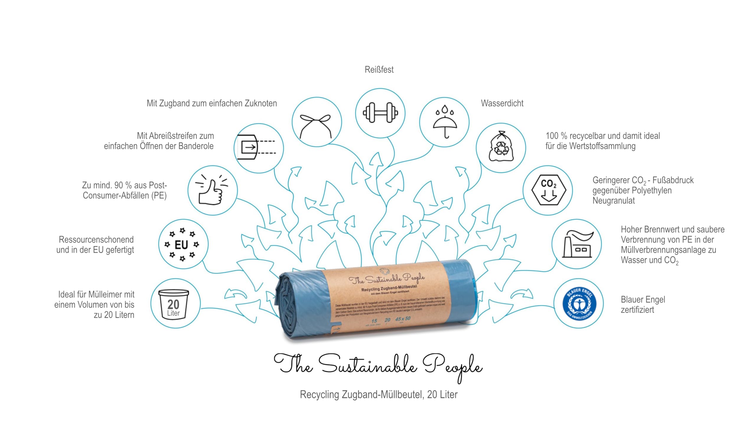 • TSP Recycling Drawstring Bin Liners, 20 L, 15-Pack, Made from 90% Post-Consumer Recycled PE, Blue Angel Certified