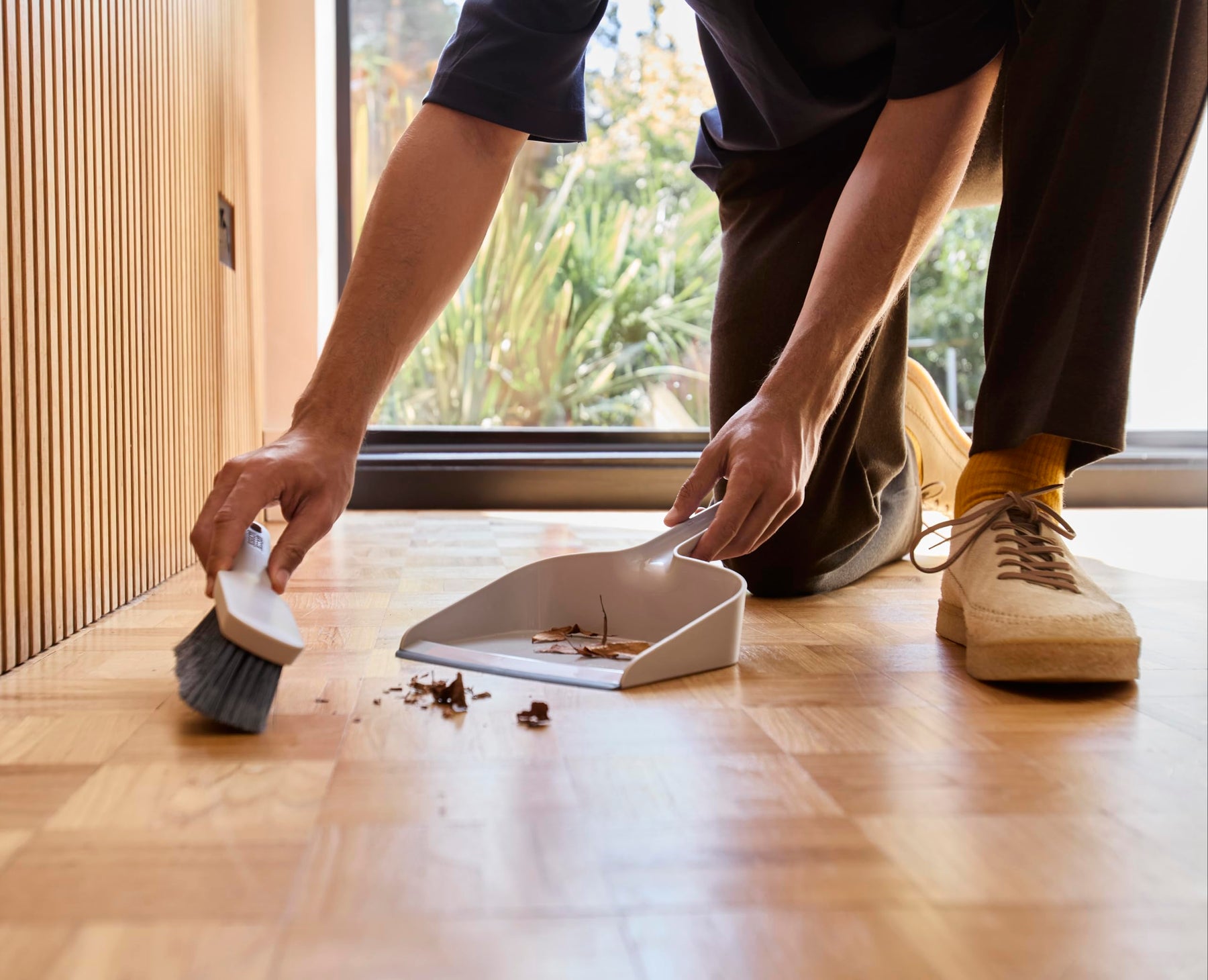 - Wall-mounted holder covers brush and pan for cleaner storage