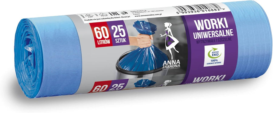 Anna Zaradna Universal Bin Liners offer reliable and durable waste disposal for everyday use. Each pack contains 25 blue bin liners with a 60-litre capacity, ideal for household, office, or public space waste management.