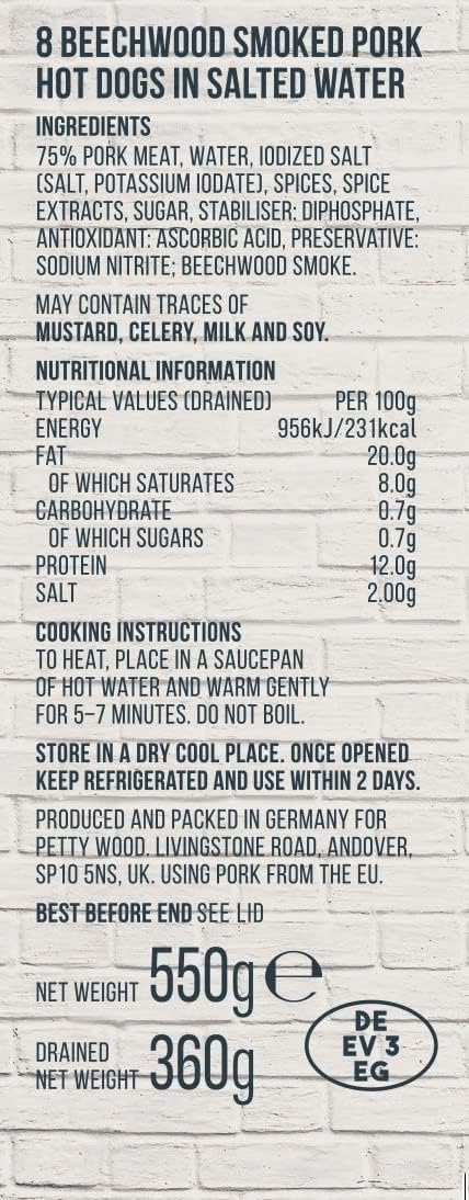 Dino’s Famous Little Franks bring authentic American flavour straight to your table. These 8 beechwood-smoked pork hot dogs are soaked in a juicy brine, ensuring rich, smoky taste and tender texture. Perfectly sized for snacking, grilling, or pairing with bold condiments, this 550 g jar is a must-have for hot dog lovers. Whether served at picnics, BBQs, or casual gatherings, these franks deliver the satisfying bite and classic taste you crave.
