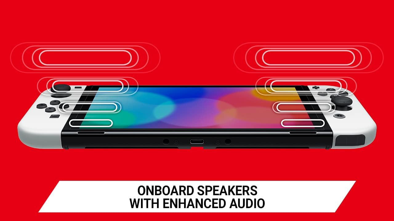 Meet the newest member of the Nintendo Switch family. The Nintendo Switch (OLED Model) features a vibrant 7-inch OLED screen with vivid colors and high contrast, delivering an immersive handheld and tabletop gaming experience. The slimmer bezel and enhanced audio bring games to life, whether you're racing at top speed or battling enemies.