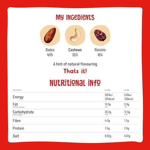 • Ingredients: Dates 49%, Cashews 35%, Raisins 16%, A hint of natural flavouring