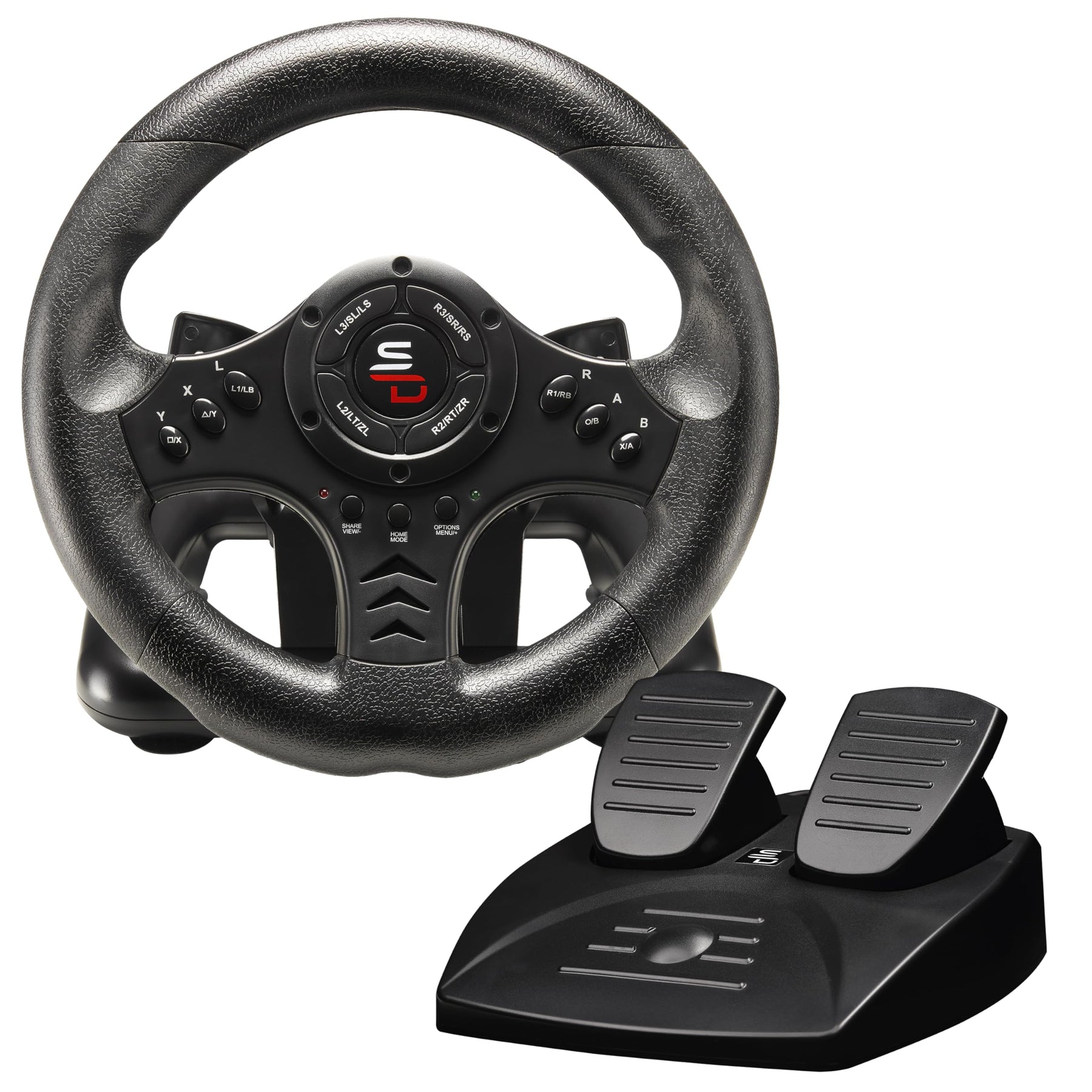 Experience immersive racing gameplay with the Superdrive SV450 steering wheel, designed for compatibility across multiple platforms including Xbox Series X/S, Xbox One, PS4, Nintendo Switch, and PC. The full-size steering wheel features dual paddle shifters (+/-) for quick gear changes and a responsive 180° rotation angle for precise control.