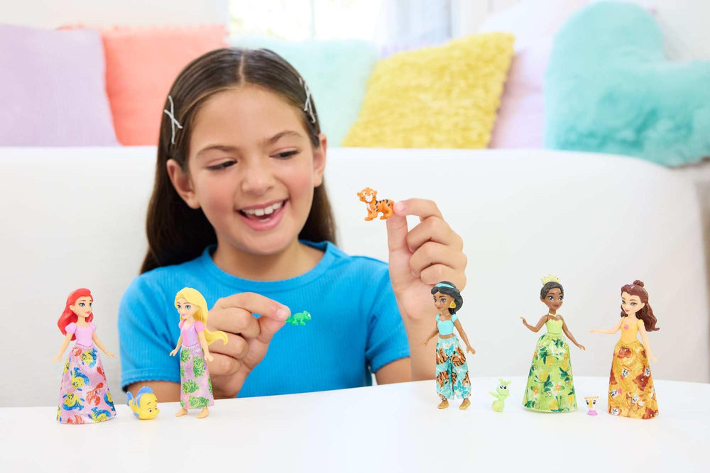 - 5 posable 3.5-inch Disney Princess dolls: Ariel, Tiana, Belle, Jasmine, and Rapunzel