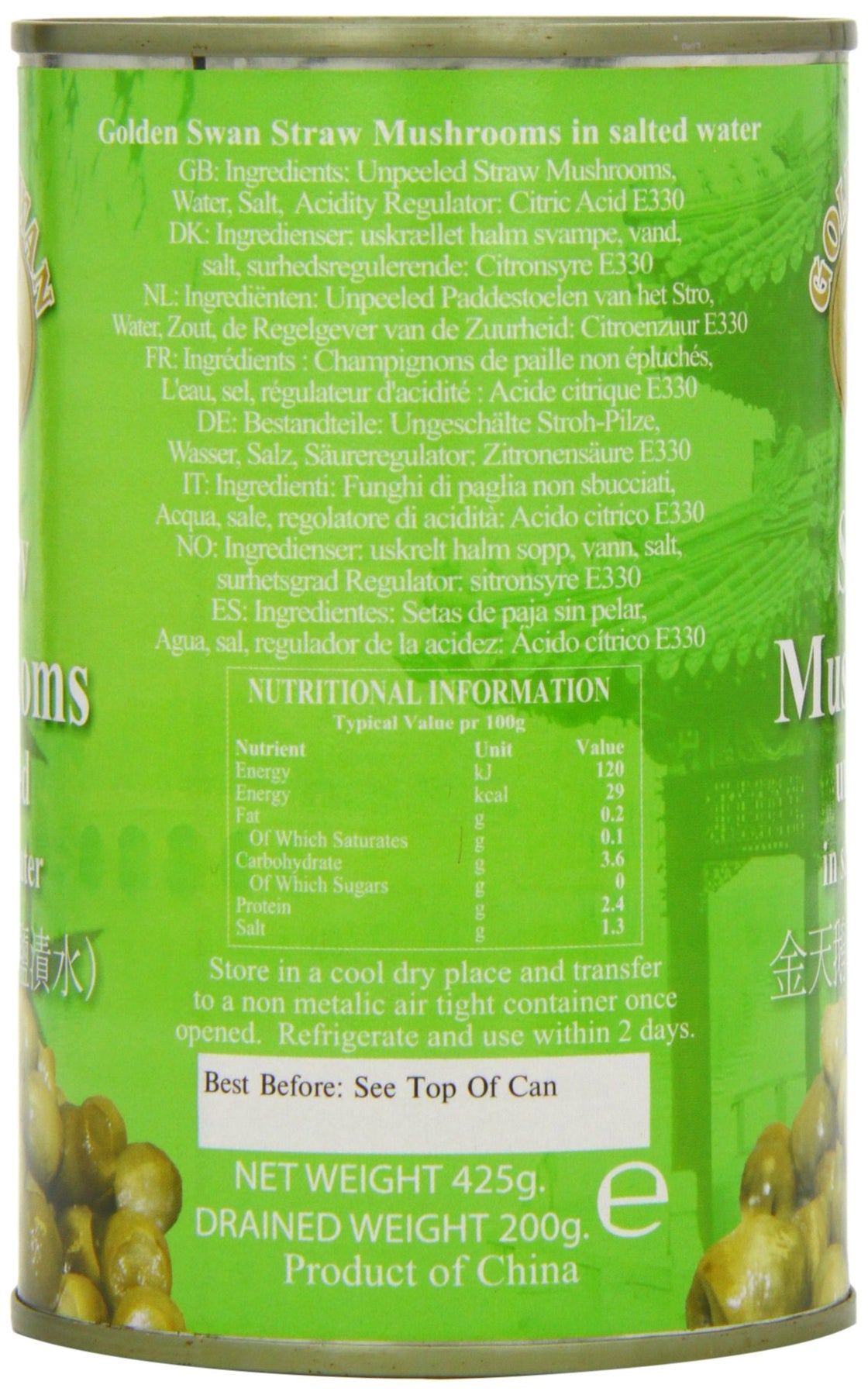 Golden Swan Straw Mushrooms Whole (Unpeeled) are a staple ingredient for creating authentic Chinese dishes. Sourced from high-quality crops, these tender and sweet mushrooms offer rich flavor and excellent texture, making them ideal for a variety of culinary applications. Packed in brine and sold in convenient 425g cans, they are ready to use in your favorite recipes.