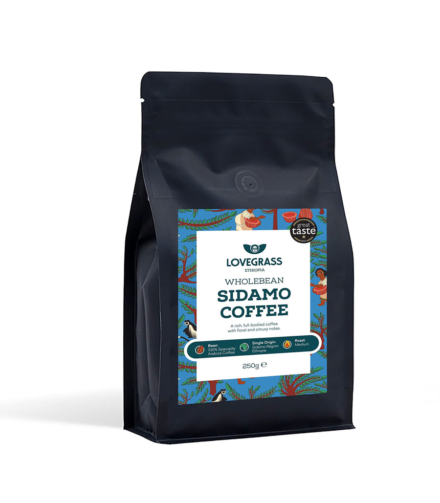 Experience the rich, full-bodied taste of authentic Ethiopian Sidamo coffee with Lovegrass Ethiopia's single origin, whole bean medium roast. Sourced from the renowned Sidamo region, this 100% specialty Arabica coffee features a washed process, delivering a clean cup with floral and citrusy notes, sweet uniform acidity, and subtle hints of clove and cinnamon. Celebrated for its delicious balance and smooth aftertaste, it's the perfect way to kickstart your day.