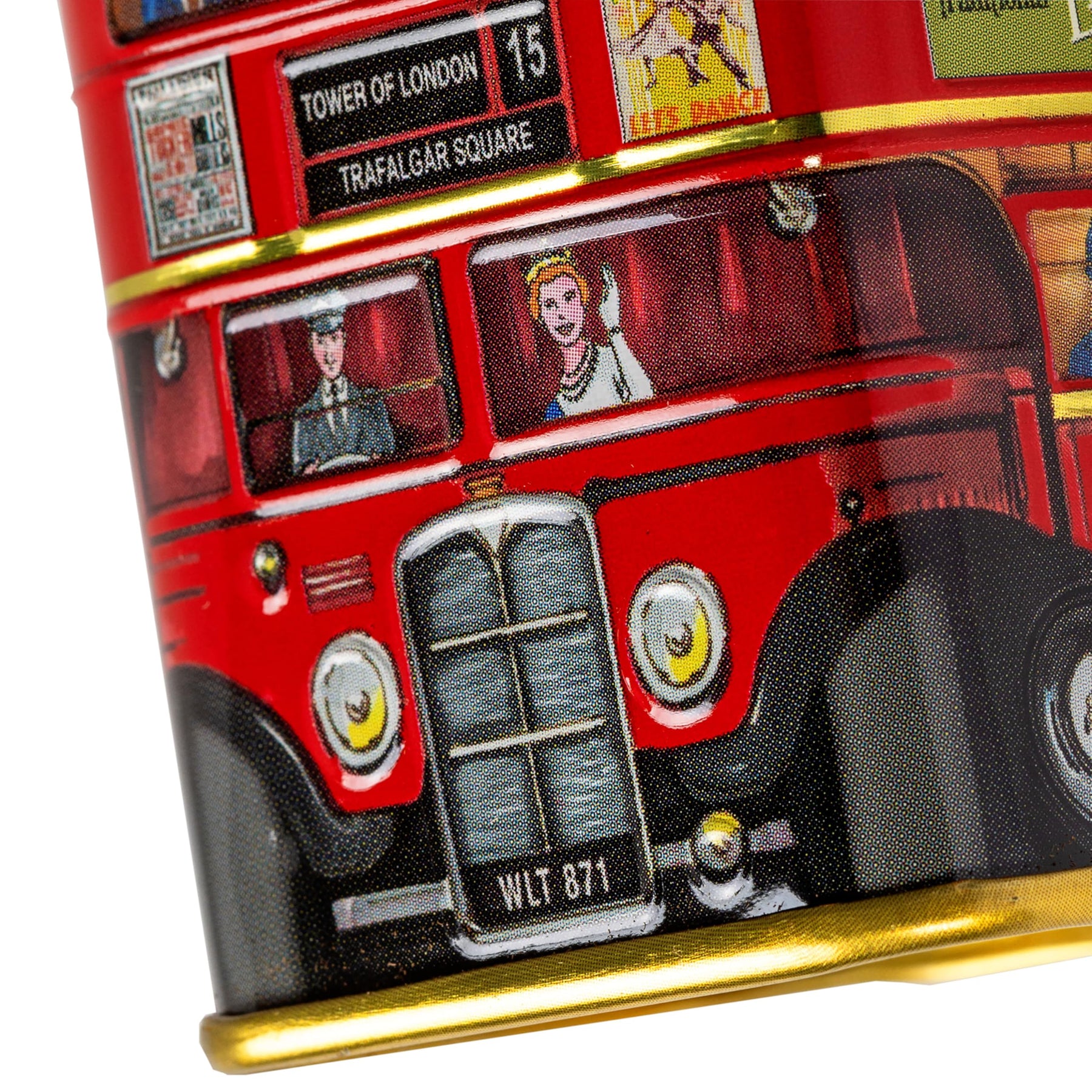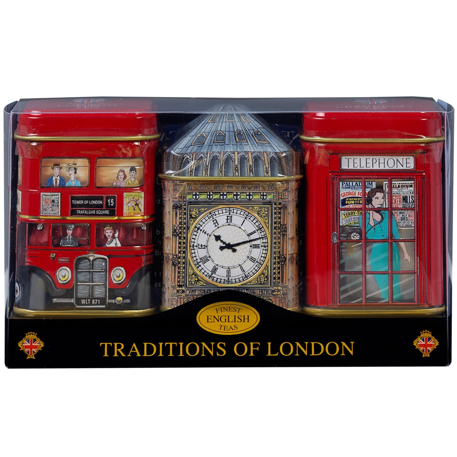New English Teas presents a classic set of three miniature tins of tea, each showcasing iconic symbols of London: the Routemaster bus, the red telephone box, and Big Ben. Carefully packaged in a protective acetate presentation sleeve, this collection makes a perfect gift or souvenir of England. Each tin contains premium loose-leaf tea sourced from Ceylon, featuring traditional blends like English Breakfast and London Tea, known for their full, rich flavor.