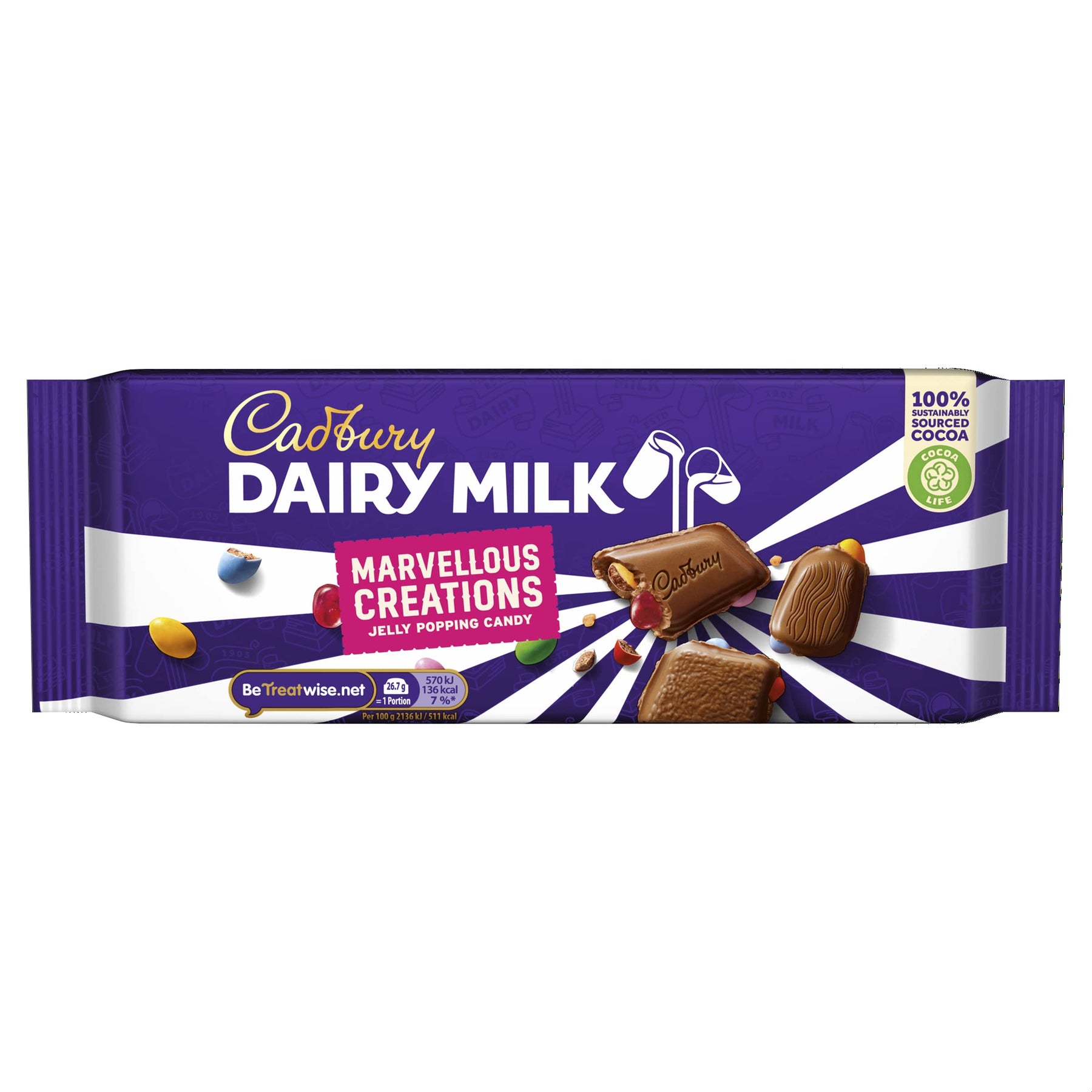 Indulge in a fun and fizzy twist on a classic with Cadbury Dairy Milk Marvellous Smashables Jelly & Popping Candy. This 162g milk chocolate bar blends smooth Cadbury chocolate with fruity jelly pieces, sugar-coated cocoa candies, and crackling popping candy for a truly marvellous taste sensation that dances on your tongue.