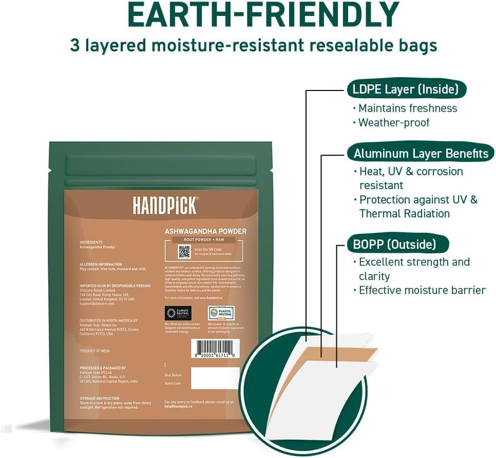 Support your daily wellness routine with this traditionally crafted herb, combining ancient Ayurvedic wisdom with modern sustainability practices. HANDPICK is committed to quality, purity, and environmental responsibility, ensuring every scoop delivers authentic Indian wellness.