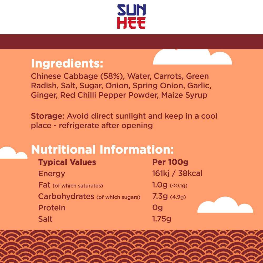 • Ingredients: Chinese cabbage (58%), water, carrots, green radish, salt, sugar, onion, spring onion, garlic, ginger, red chilli pepper powder, maize syrup