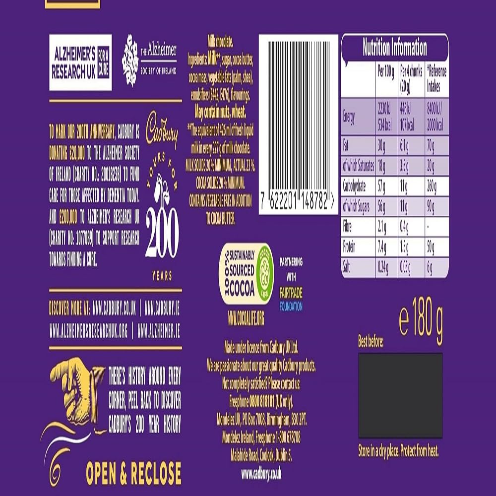 The chocolate contains a minimum of 20% cocoa solids and 20% milk solids (actual 23%), with the equivalent of 426ml of fresh liquid milk in every 227g of milk chocolate. Ingredients include sugar, cocoa butter, cocoa mass, vegetable fats (palm, shea), emulsifiers (E442, E476), and natural flavourings. May contain traces of nuts and wheat.