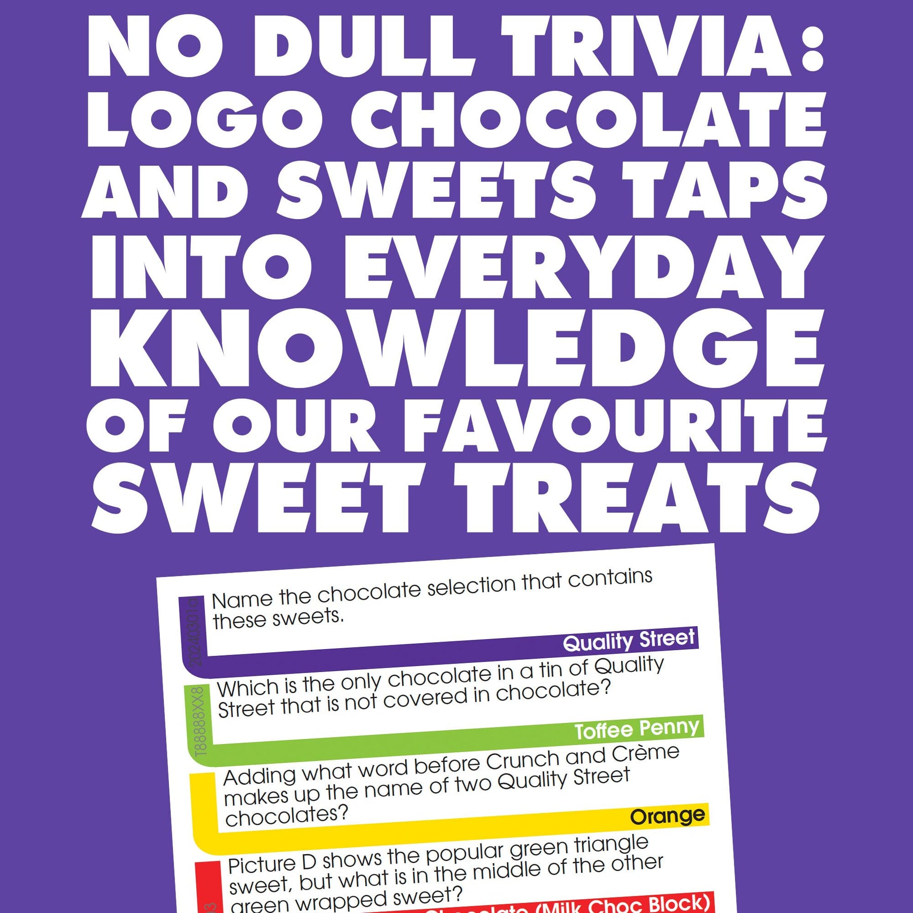 Test your knowledge of everyone’s favourite chocolate and sweets with the LOGO Chocolate & Sweets Mini Game! This fun and engaging trivia game challenges your sweet tooth and memory skills, making it perfect for gatherings, adult game nights, or family fun. With a delightful candy-themed twist, it brings laughter and friendly competition to any occasion.
