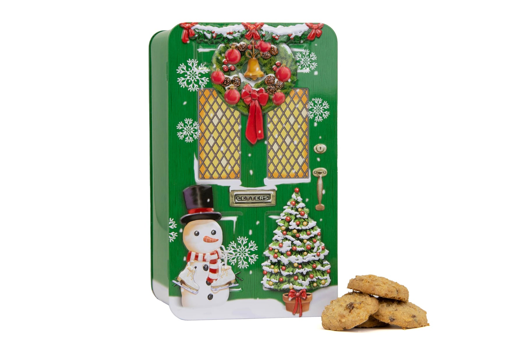 • Festive green embossed biscuit tin shaped like a Christmas door