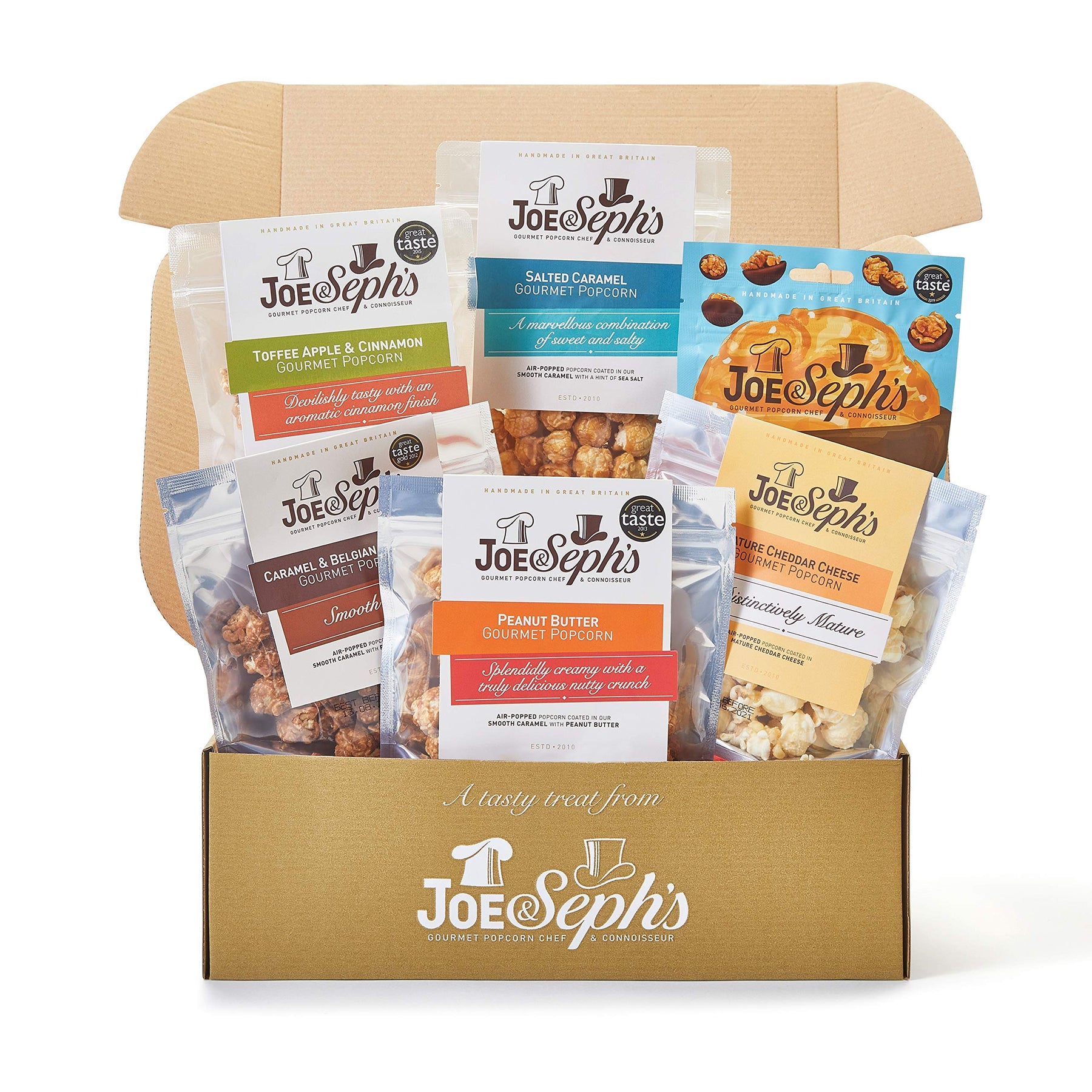 Indulge in a premium movie night experience with Joe & Seph's handcrafted Gourmet Popcorn & Chocolate Bites Gift Box. Each box is filled with award-winning, 100% natural popcorn and sweet and savory snack packs, perfect for gifting or treating yourself.