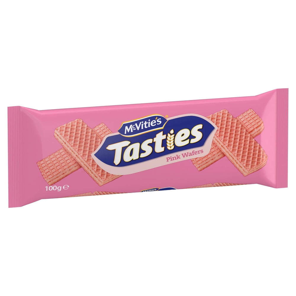 Enjoy the timeless taste of McVitie's Tasties Pink Wafer Biscuits – a delightful treat that brings a touch of sweetness to your day.