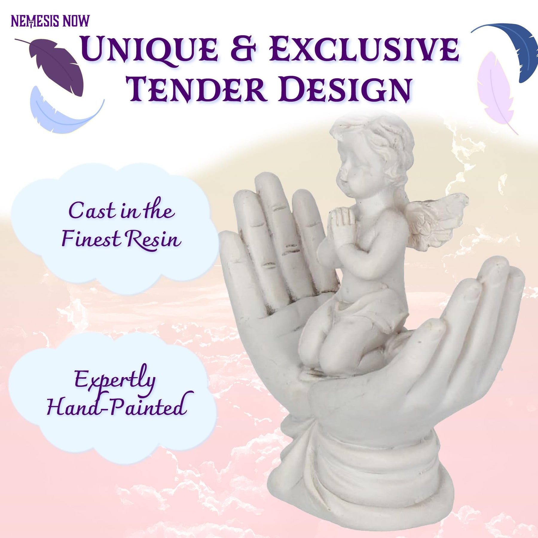 Cradled in the palms of two protective hands, a delicate cherub kneels in prayer, symbolizing divine guardianship and parental care. This serene figurine from Nemesis Now's angel collection captures a moment of spiritual protection and tenderness, making it a meaningful addition to any home or gift for new parents.