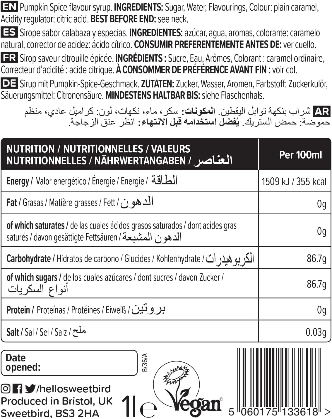 Fruity and warming, Sweetbird Pumpkin Spice Syrup is the perfect ingredient for a delicious seasonal treat. Made with real cinnamon, ginger, and clove, this syrup delivers an authentic autumnal flavour ideal for lattes, frappes, hot chocolates, and other hot or cold beverages. With just two pumps (15ml), you can transform any drink into a modern classic.