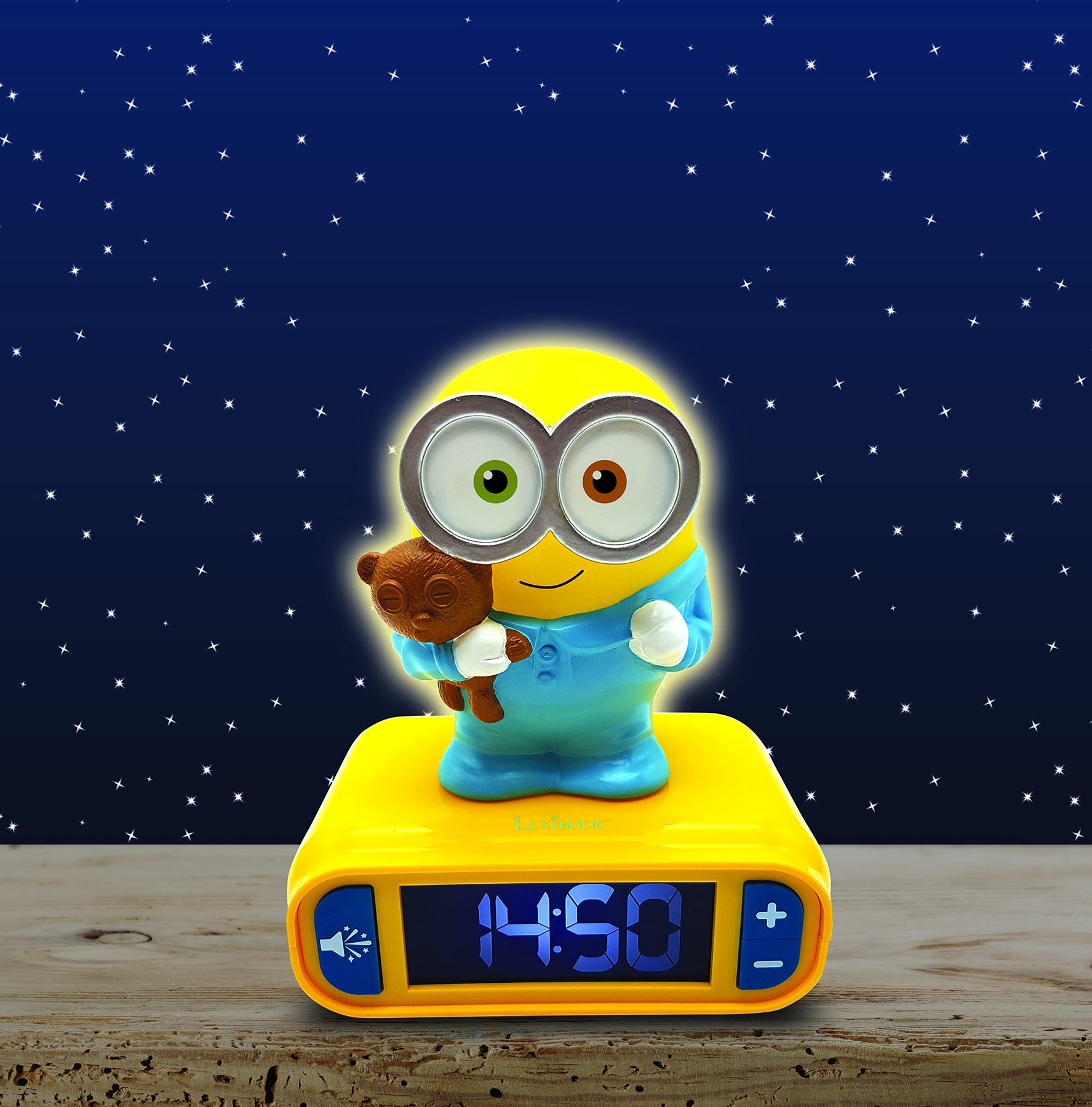 Make mornings fun and bedtime calming with this LEXIBOOK Minions digital alarm clock featuring everyone's favorite character, Bob! Designed specifically for kids, this interactive clock lights up when pressed, serving as both a gentle night light and an engaging wake-up companion. With its playful Minions sound effects and cheerful ringtones, it turns the daily routine into a joyful experience.
