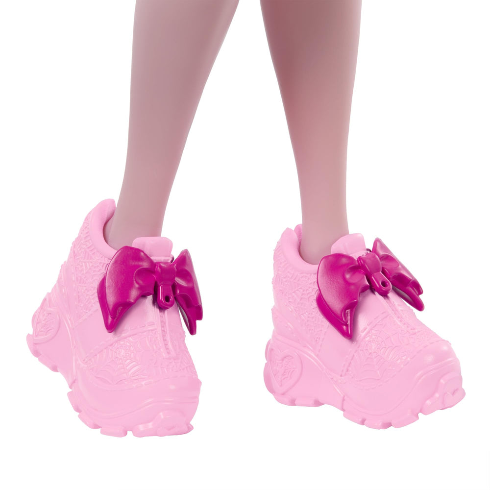 - Detailed outfit includes a pink heart dress, spiderweb jacket, and matching beret