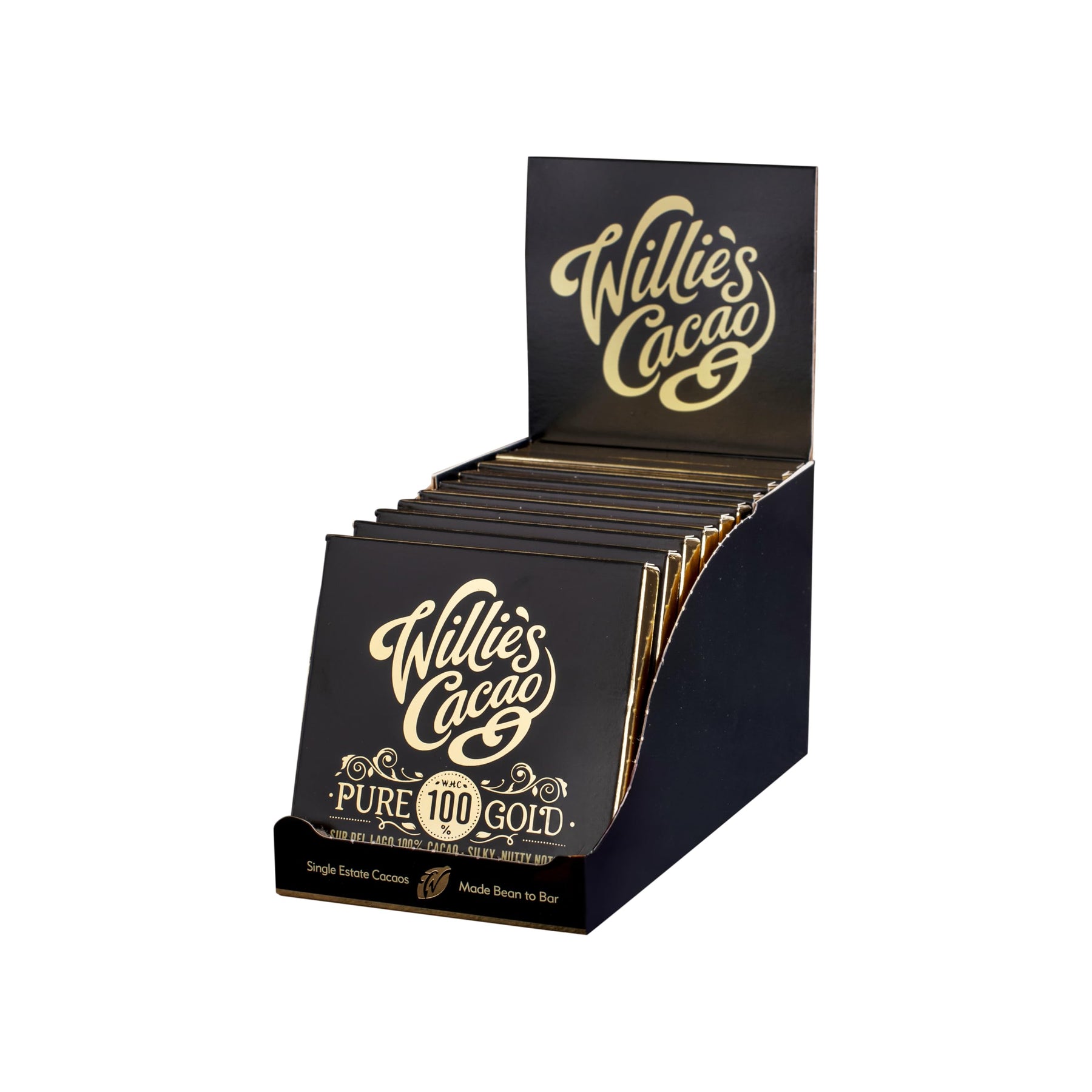 Willie's Cacao Pure Gold is an extraordinarily smooth 100% cacao chocolate with no added sugar, crafted from fine Sur del Lago cacao beans known for their silky, nutty notes. Made in small batches using traditional bean-to-bar methods, this artisan chocolate is slow-roasted at low temperatures over up to 21 days to preserve the pure, natural flavours—unlike industrial chocolate that sacrifices quality for speed. Free from vanilla, lecithin, dairy, soya, gluten, and palm oil, it’s a clean, vegan chocolate experience for purists and connoisseurs alike.