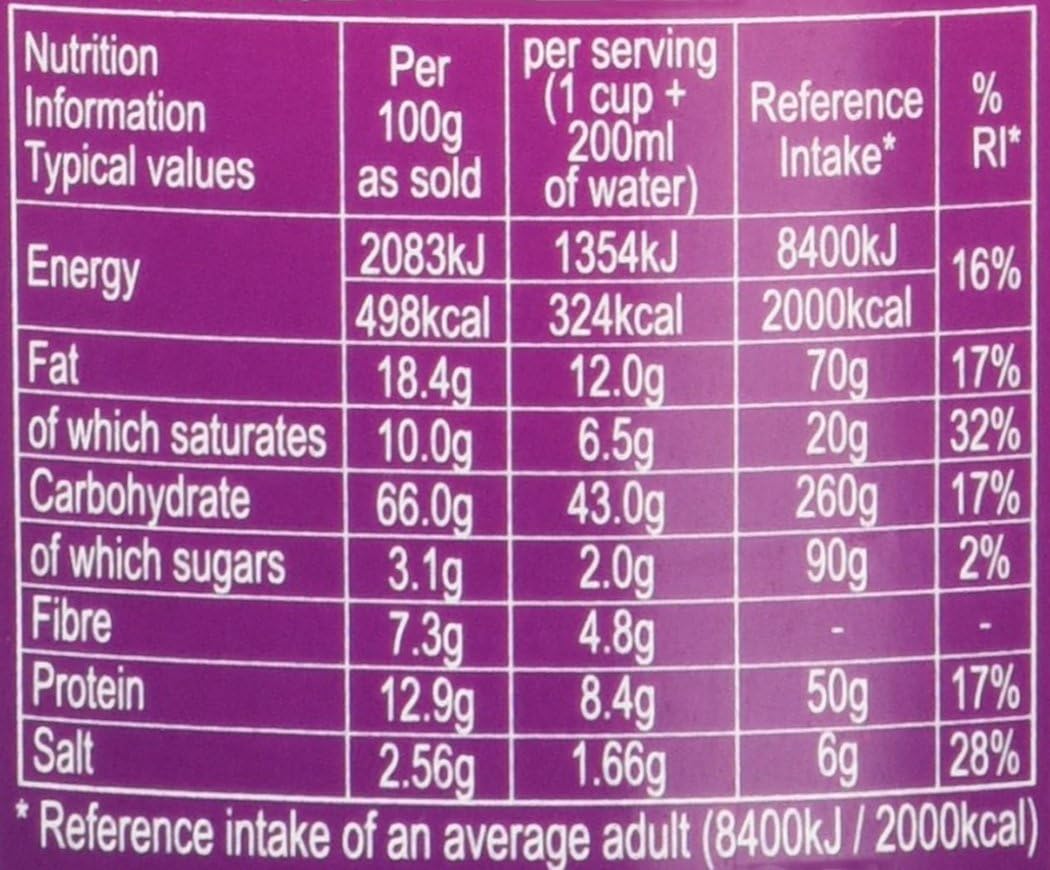 • Ingredients: WHEAT Flour (Gluten), Palm Oil (Contains Tocopherol, Antioxidant E306), Water, Salt; Seasoning: Maltodextrin, Curry Flavour, Potato Starch, WHEAT Flour (Gluten), Salt, Sugar, Monosodium Glutamate (E621), Yeast Extract, Palm Oil, Silicon Dioxide (E551), Disodium Inosinate, Disodium Guanylate (E627, E631), Dehydrated Vegetables (AD Carrot Flakes, FD Peas, FD Corn, FD Chives)