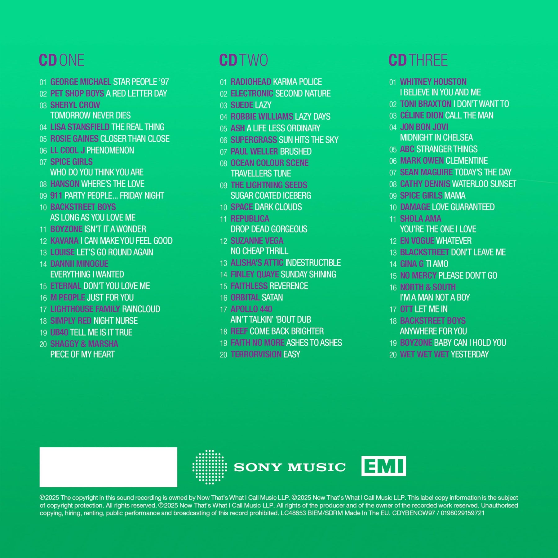 NOW – Yearbook Extra 1997 is a must-have 60-track 3CD compilation celebrating one of the most dynamic years in pop music history. Released on August 8th, this collection captures the diverse sounds of 1997, from chart-topping pop anthems to groundbreaking alternative and electronic tracks. CD1 features iconic hits from George Michael, Pet Shop Boys, Spice Girls, Backstreet Boys, and Shaggy, showcasing the era's biggest pop and reggae-pop crossovers. CD2 dives into the indie and alternative scene with Radiohead’s 'Karma Police', Supergrass, Paul Weller, and Faithless, highlighting the experimental edge of late-'90s rock and electronica. CD3 opens with Whitney Houston and Toni Braxton, delivering powerful R&B and soul vocals, and includes Jon Bon Jovi's solo work, rounding out a year of musical diversity and innovation.
