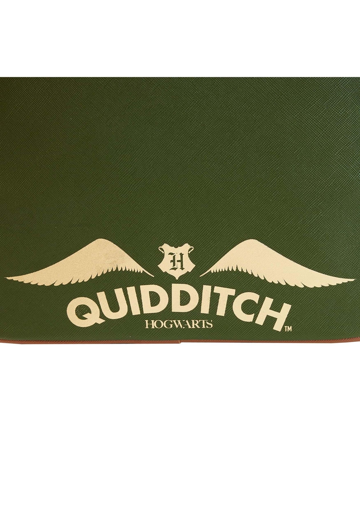 Experience the magic of Quidditch with the Loungefly Harry Potter Golden Snitch Mini Backpack. Featuring a shimmering gold metallic Golden Snitch with movable wings on the circular front pocket, this backpack brings the excitement of the Hogwarts game to life. Applique and printed details depict the Quidditch field in the background, with each House represented on the side pockets. A raised metal zipper charm of a Seeker on a broom adds an authentic touch, while gold metallic print on the back spells out "Quidditch" and "Hogwarts".